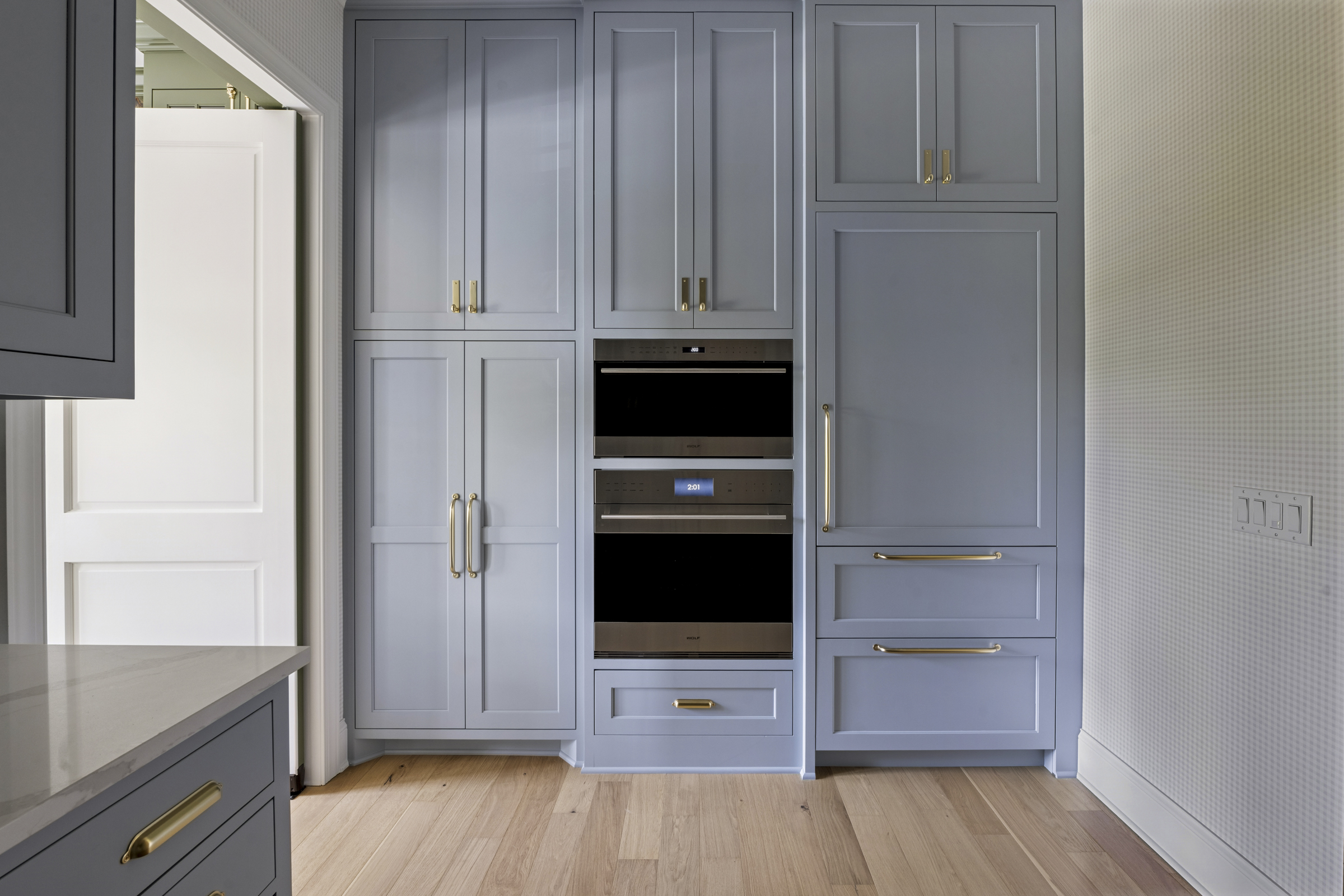 Door choice also plays a big role in how a butler’s pantry feels from the main kitchen. A hidden door that blends into the cabinetry creates a seamless look, while a pivot door can be more practical. Both options allow the pantry to be closed off while still being highly functional behind the scenes.